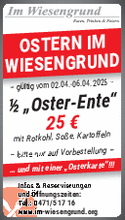 In dieser Zeit nehmen wir keine Bestellungen an. Über den Anrufbeantworter (wenn Sie eine Telefonnummer hinterlassen) oder per Email (Info@im-wiesengrund.org) können sie weiterhin ihre Reservierungen anfragen. Sobald wir wieder im Hause sind, werden wir uns so schnell wie möglich um ihr Anliegen kümmern.